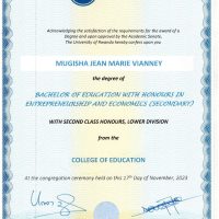I am hold by Bachelor’s degree in Economic and Entrepreneurship with Education, after finishing my studies in University of Rwanda I employed by the person who working her self , means she is business woman.